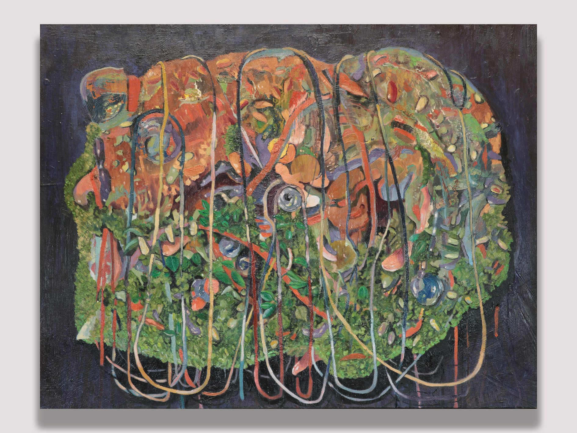 A selection of oil paintings on various sizes of wooden board, depicting different elements in an otherworldly and accumulative style.